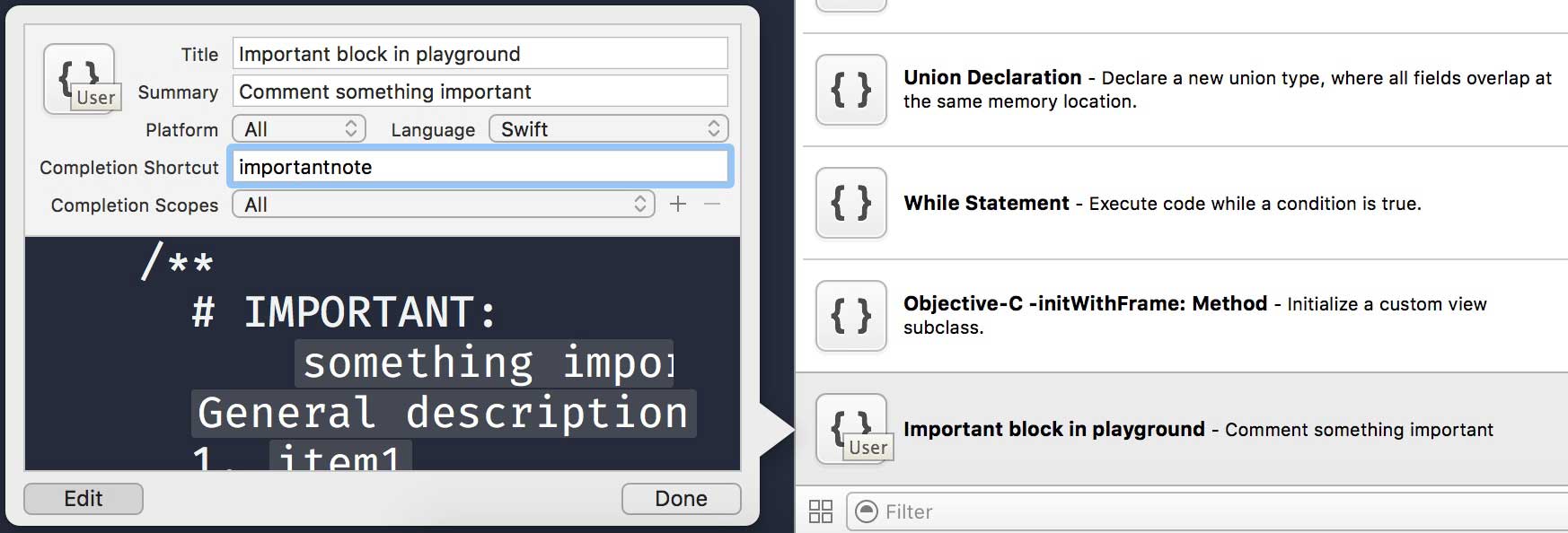 设置完成后,点击"Done"。这样当我们在Swift代码里输入importantnote的时候,就能调出需要的注释片段,我们只要直接设置其中的内容就好了。